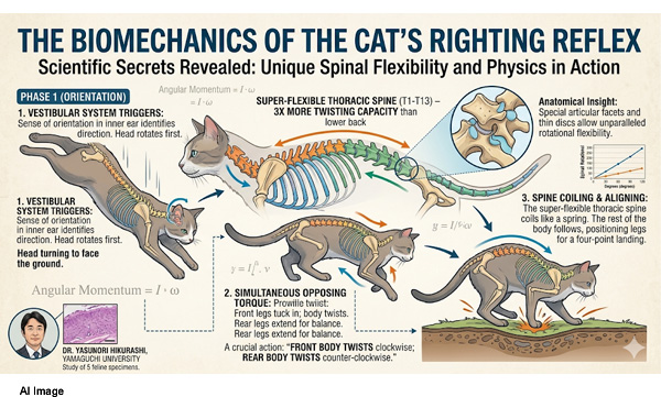 പുറമേ നിന്നുള്ള പ്രേരണയില്ലാതെ ഒരു വസ്തുവിന് സ്വയം കറങ്ങാൻ കഴിയില്ലെന്ന ശാസ്ത്ര സിദ്ധാന്തത്തെ വെല്ലുവിളിക്കുന്ന ഈ ചലനം, നട്ടെല്ലിന്റെ അവിശ്വസനീയമായ വഴക്കം മൂലമാണ് സാധ്യമാകുന്നത്. അഞ്ച് പൂച്ചകളുടെ നട്ടെല്ലുകളിൽ നടത്തിയ വിശദമായ പഠനത്തിലൂടെയാണ് ഈ കറക്കത്തിന്റെ രഹസ്യം ശാസ്ത്രലോകം സ്ഥിരീകരിച്ചത്.