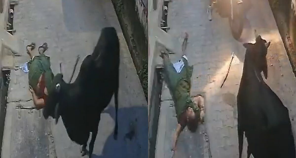 സ്ത്രീയെ തെരുവു കാള കുത്തി മറിച്ചു, വായുവില് കരണം മറിഞ്ഞ് ബോധരഹിതയായി നിലത്ത് വീണു- വീഡിയോ