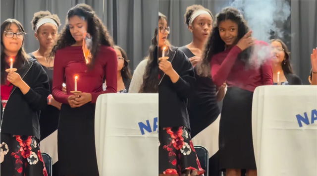 സ്കൂൾ വേദിയിൽവച്ച് മുടിക്ക് തീപിടിച്ചു; മനോധൈര്യത്തോടെ നേരിടുന്ന പെൺകുട്ടി- 6 കോടി ആളുകൾ കണ്ട വീഡിയോ