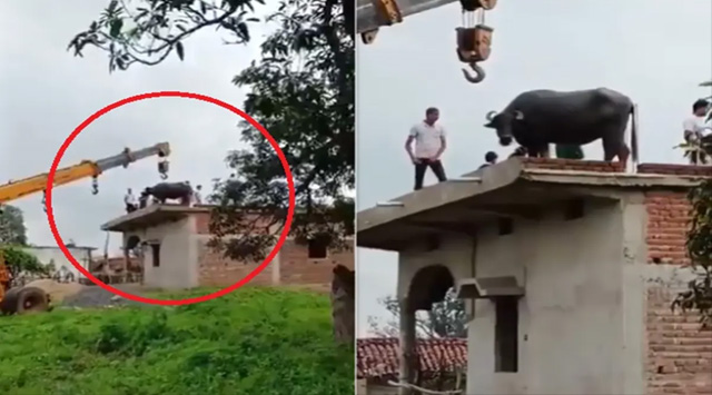 മഴയിൽ നിന്ന് രക്ഷപ്പെടാൻ മേൽക്കൂരയിൽ കയറി, പോത്തിനെ താഴെയിറക്കിയത് ക്രെയിൻ ഉപയോഗിച്ച്- വീഡിയോ
