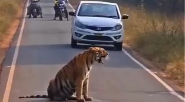അവിടെ നില്‍ക്ക്, അല്‍പ്പം കഴിഞ്ഞുപോകാം! കടുവ റോഡ് തടഞ്ഞു, ഗതാഗതം മണിക്കൂറുകളോളം സ്തംഭിച്ചു- വീഡിയോ