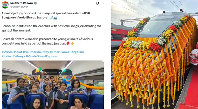 സ്കൂള് യൂണിഫോം ധരിച്ച ഒരു കൂട്ടം വിദ്യാര്ത്ഥികളും രണ്ട് പേരുമാണ് ഗണഗീതം ആലപിക്കുന്നത്. ”എറണാകുളം-കെഎസ്ആര് ബെംഗളൂരു വന്ദേഭാരത് എക്സ്പ്രസ് ഉദ്ഘാടനത്തില് സന്തോഷത്തിന്റെ ഈണം. ഈ നിമിഷത്തിന്റെ ചൈതന്യം ആഘോഷിക്കുന്നതിന് സ്കൂള് വിദ്യാര്ത്ഥികള് ദേശഭക്തി ഗാനം പാടി.” എന്നാണ് വീഡിയോ പങ്കുവെച്ചുകൊണ്ടുള്ള കുറിപ്പ്.